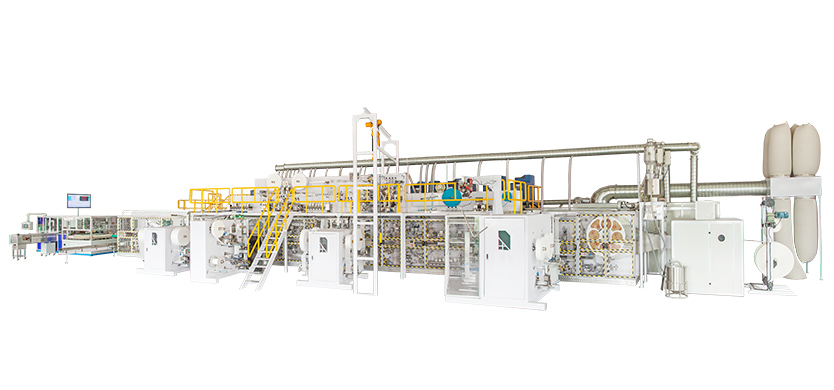 基本生產工藝配置: 高速粉碎機(可使用未處理槳) 棉芯成型機構 高分子下料機構 原材料供給機構 內芯產品組合刀具 內芯產品轉移機構 腰圍橡筋機構 中折機構 終切組合刀具 供氣機構 安全防護機構 |